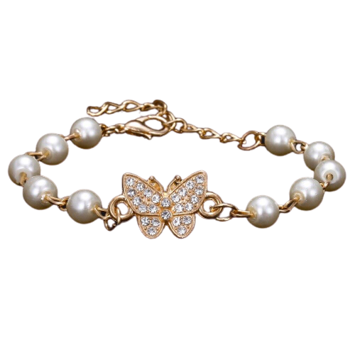 Add a touch of glamour to your wrist with our gold butterfly bracelet. The pearls and white diamonds are the perfect matches for an eye-catching piece.