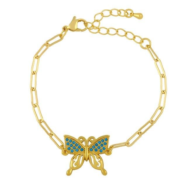 This gold butterfly bracelet features a classic chain link design with a gold butterfly with blue stones to have a refined look.